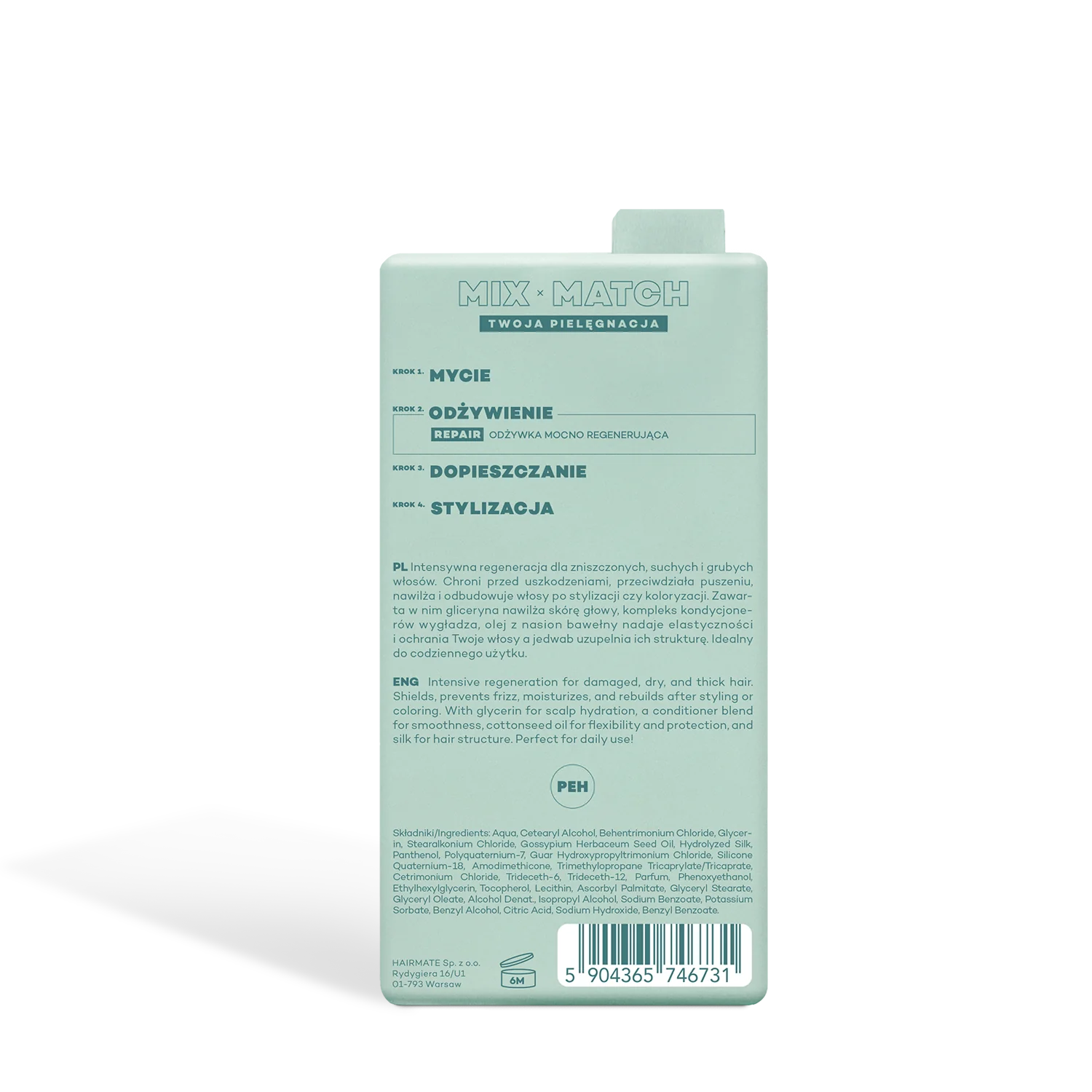 Hairmate Repair to odżywka PEH (proteinowo-emolientowo-humektantowa), stworzona specjalnie dla włosów zniszczonych, suchych oraz o średniej i grubej strukturze. Przeznaczona do codziennej pielęgnacji, skutecznie odbudowuje włosy, przywracając im zdrowy wygląd i naturalny blask.