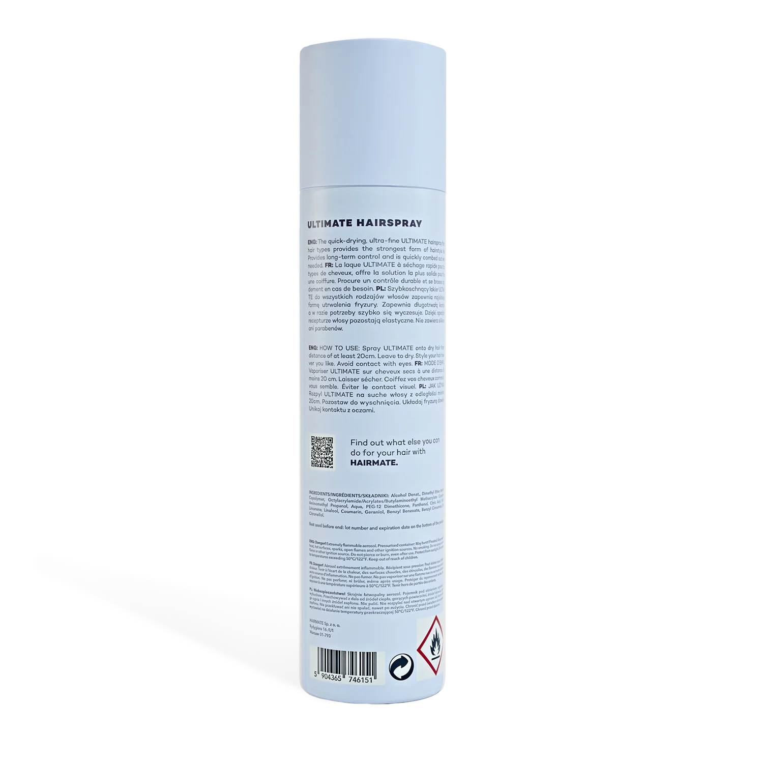 Hairmate Ultimate to lakier do włosów, który zapewnia mocne utrwalenie fryzury bez obciążania pasm. Idealny do każdego rodzaju włosów, gwarantuje trwałość stylizacji, zachowując jednocześnie elastyczność i naturalny wygląd.