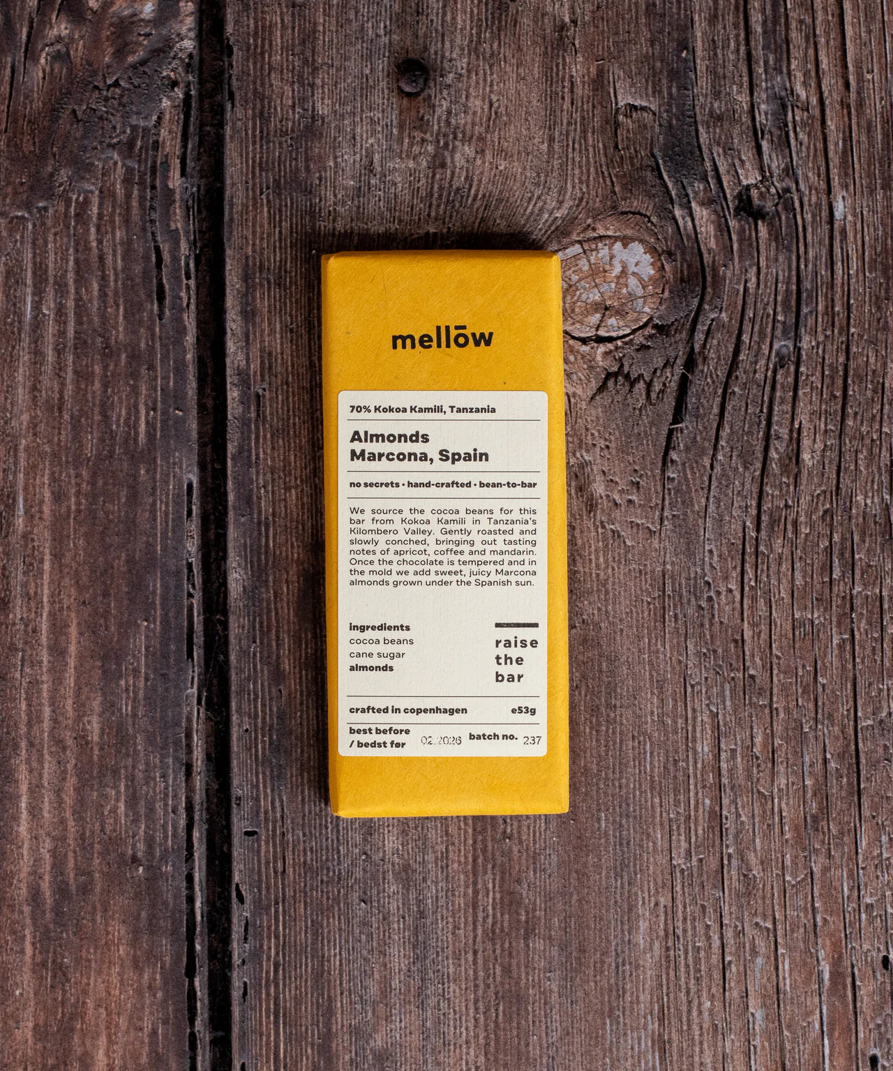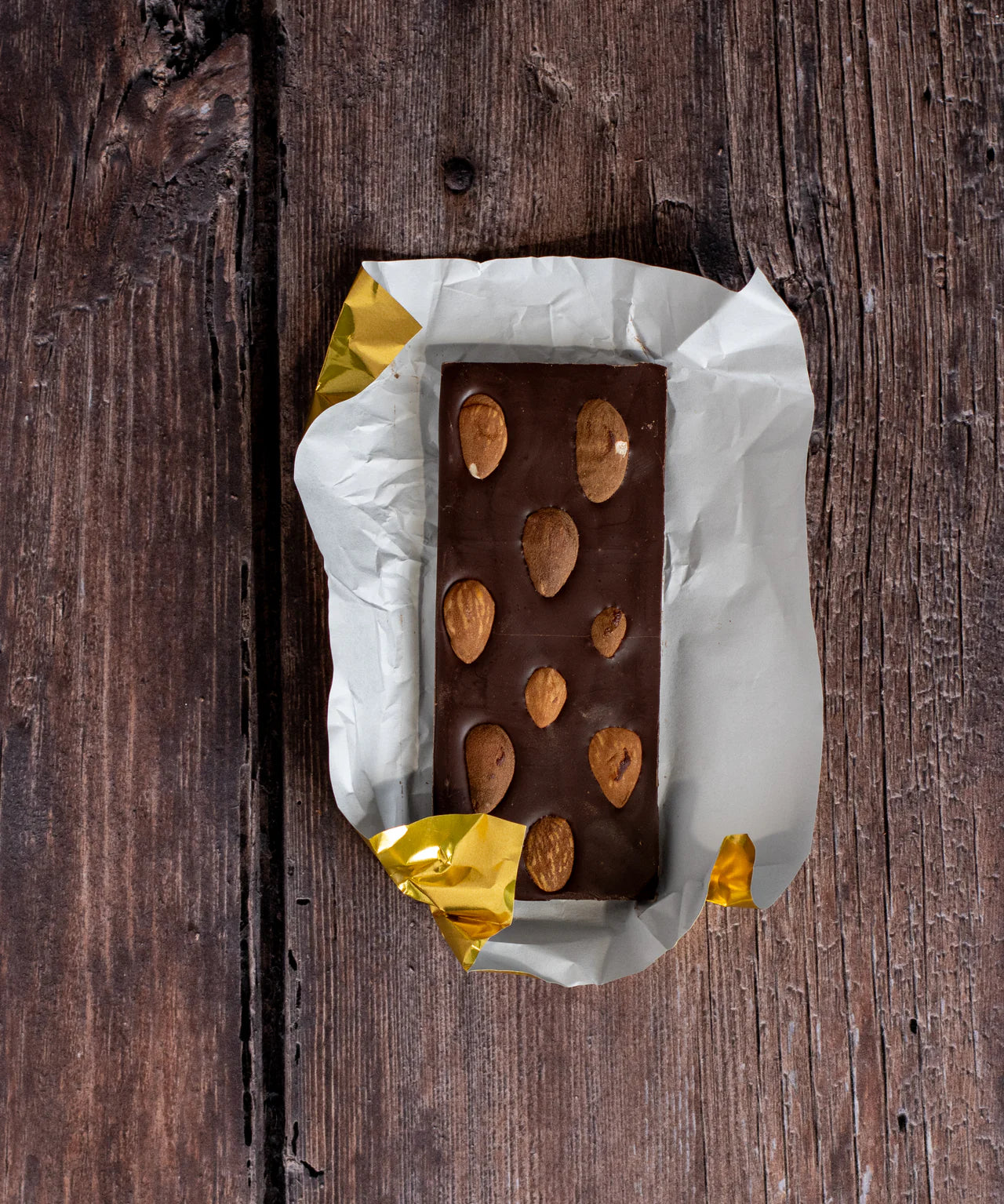 Zrównoważona czekolada deserowa o bogatych owocowych nutach, z delikatnym akcentem drewna, przełamana chrupiącymi, słodkimi migdałami Marcona.
